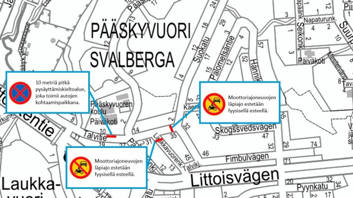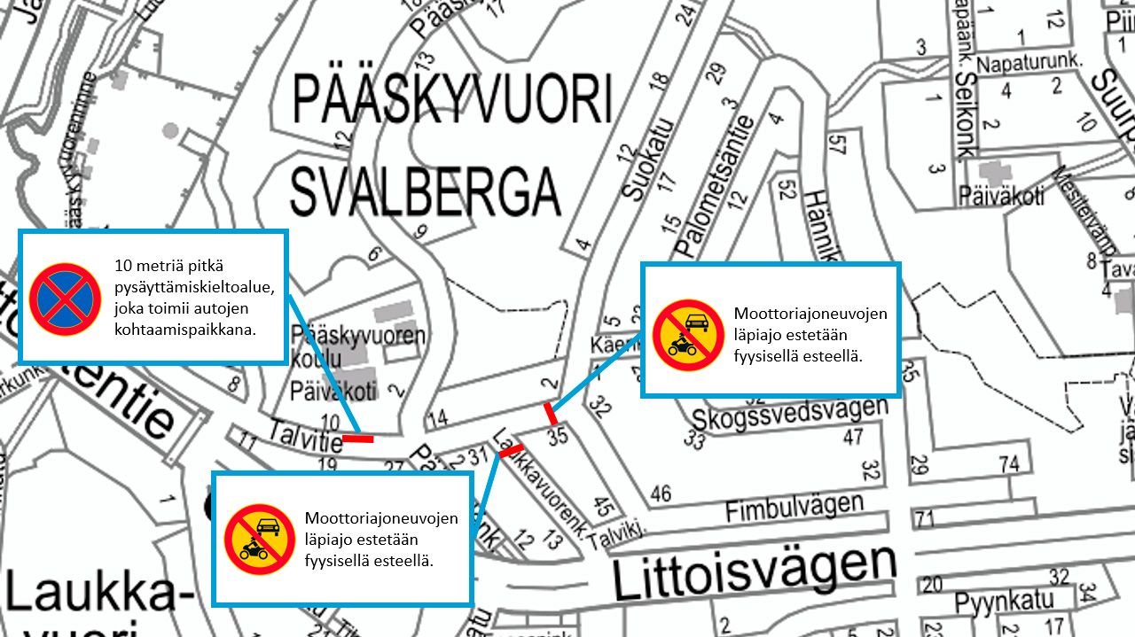 Samalla Talvitie merkitään pihakaduksi Pääskynlennon ja Suokadun väliseltä osuudelta, jotta koululaisliikenteen kulku mahdollistetaan kadun kaikilla osilla.
