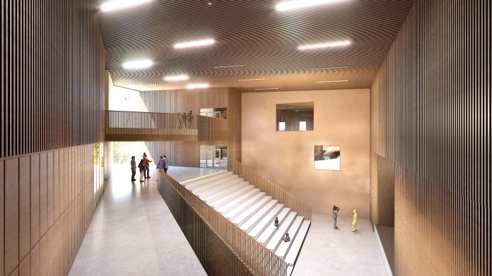 Näkymä koulun sisällä havainnekuvassa. Kuva: Arkkitehtitoimisto Perko Oy