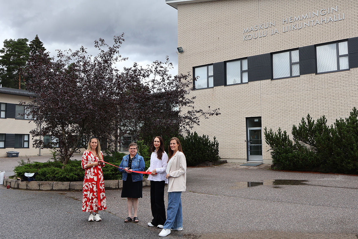 Valmistunut saneeraus oli mukana Maskun suurella vihkiäisviikolla. Korjaustyötä satiininauhoineen olivat 21.8. vihkimässä kunnanjohtaja Miira Raiskilan kanssa rehtori Eliisa Hyle-Sjövall ja vararehtori Mirva Juselius sekä kunnanhallituksen puheenjohtaja Katriina Hiippavuori.