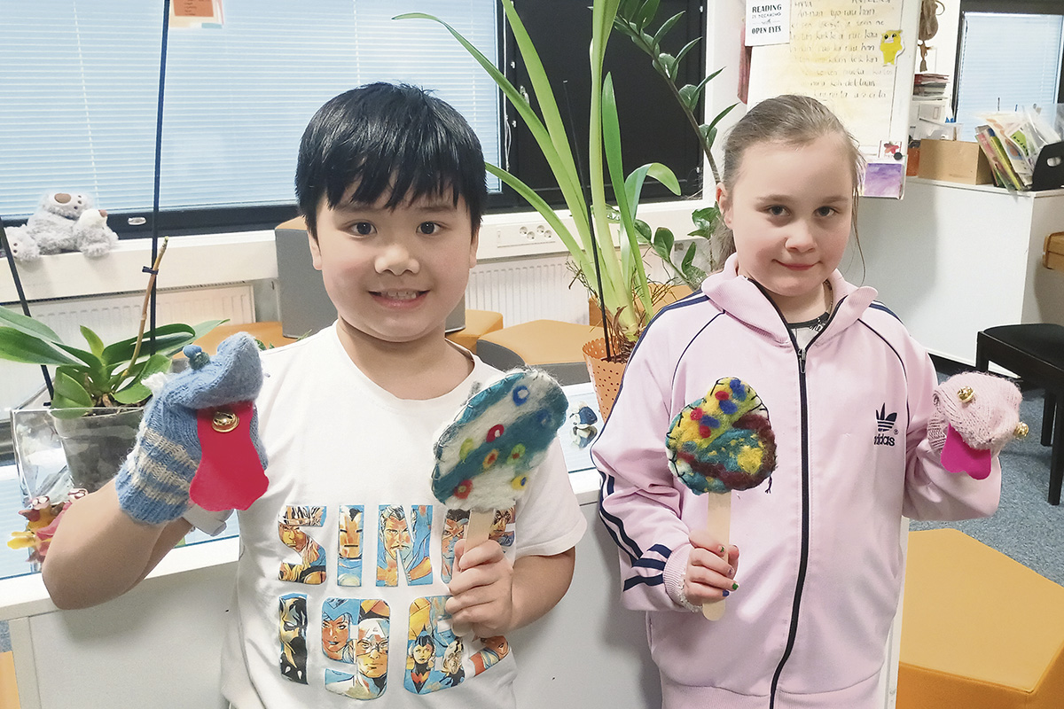 Oppilaat valmistivat läsnäolotikkarit, jotka valmistuivat märkä- ja neulahuovutustekniikoin. Samalla he opettelivat kirjontatekniikoista pykäpiston. Lisäksi he ovat askarrelleet villasukista Töppötassu-nuket, joiden hiukset on kiinnitetty ryijusolmulla, sekä muovailleet tarinan mukaiset pikkuhahmot, jotka pääsivät seikkailemaan lasten tekemissä animaatioissa.